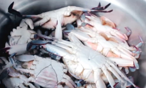 게를 깨끗하게 손질하는 것이 중요하죠. 물을 소량 넣고 바구니를 들었다 내렸다 하면서 게를 씻어줍니다.