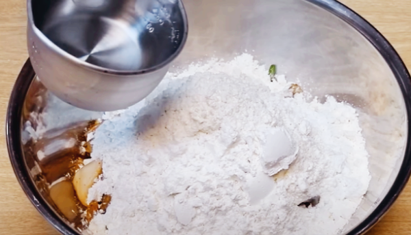약간 익었다면 튀김가루를 살짝 위에 뿌려주세요~
