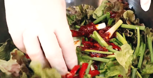 썰어 놓은 도토리묵과 채소를 큰 볼에 담고 준비한 양념장을 넣어 가볍게 무쳐줍니다.