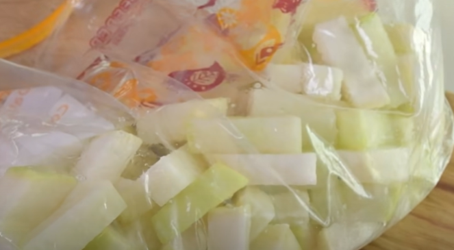 지퍼백에 무를 넣고 천일염 2큰술, 사이다 200ml를 잘 섞어 밑간해주세요.