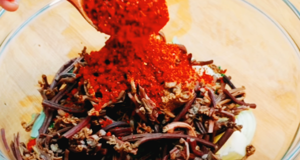 볼에 자른 얼갈이배추와 고사리를 넣고, 된장 1/2큰술, 국간장6큰술, 고춧가루를 넣어서 잘 버무려주세요.